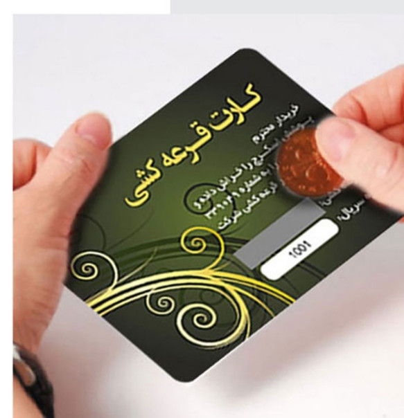 کارت قرعه کشی در جدول ویژگیهای فایل درجشده و با توجه به لایه باز بودن و کیفیت بالای طرح خام کارت مسابقه، قابلیت ویرایش و تبدیل به سایز دلخواه مانند کارت مربع، دایره، برش خاص، قالب اختصاصی و ... را دارا میباشد. طرح کارت اسکرچ دار قابلیت چاپ افست و چاپ دیجیتال روی انواع جنس کارت مانند گلاسه، لمینت، کتان، کرافت، سلفون و پیویسی و ... را دارد. همچنین میتوان از طرح های کارت جهت چاپ اتیکت، لیبل، کارت آویز و ... نیز استفاده کرد.،آخرین فرصت 15 شعبان، در صورت دریافتن کد روی کارت برنده بُن خرید 120میلیون تومانی از سایت آراداس خواهید شد کد مورد نظر در روی اول سایت درج شده